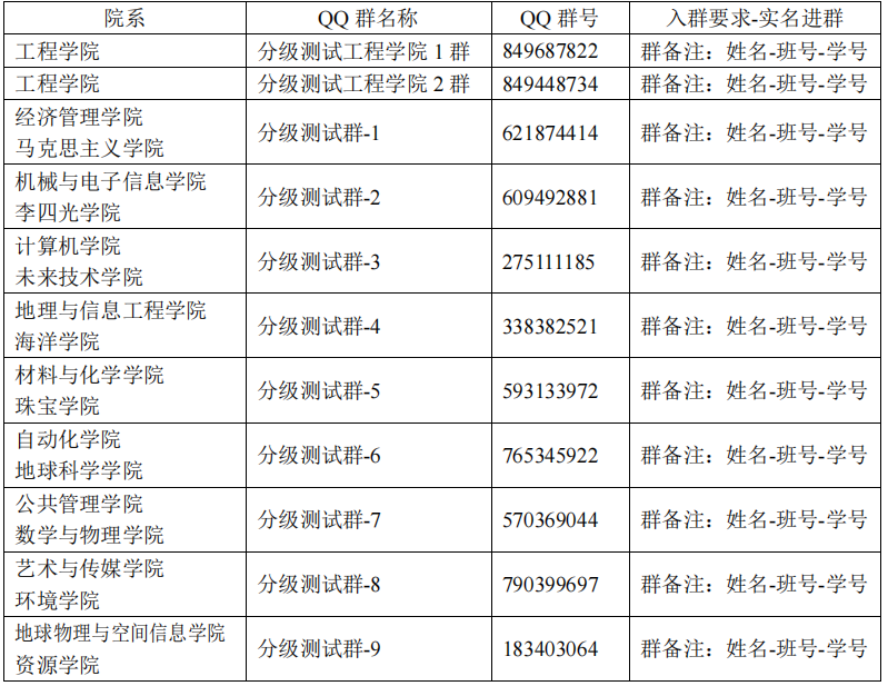 請不同院系學(xué)生提前實名加入新生分級測試對應(yīng)QQ群(工程學(xué)院的新生進(jìn)分級測試工程學(xué)院1群或2群均可)。學(xué)生在使用iTEST過程中若有任何問題,可通過QQ群向管理員老師咨詢。具體安排如下: