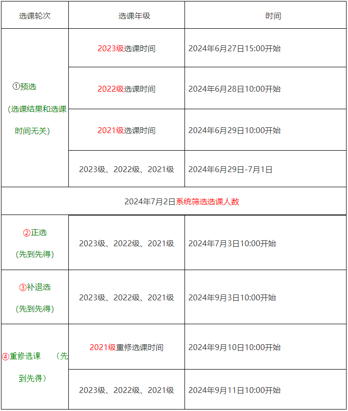 4. 重修選課輪次:2024年9月10日(周二)10:00——9月15日。
