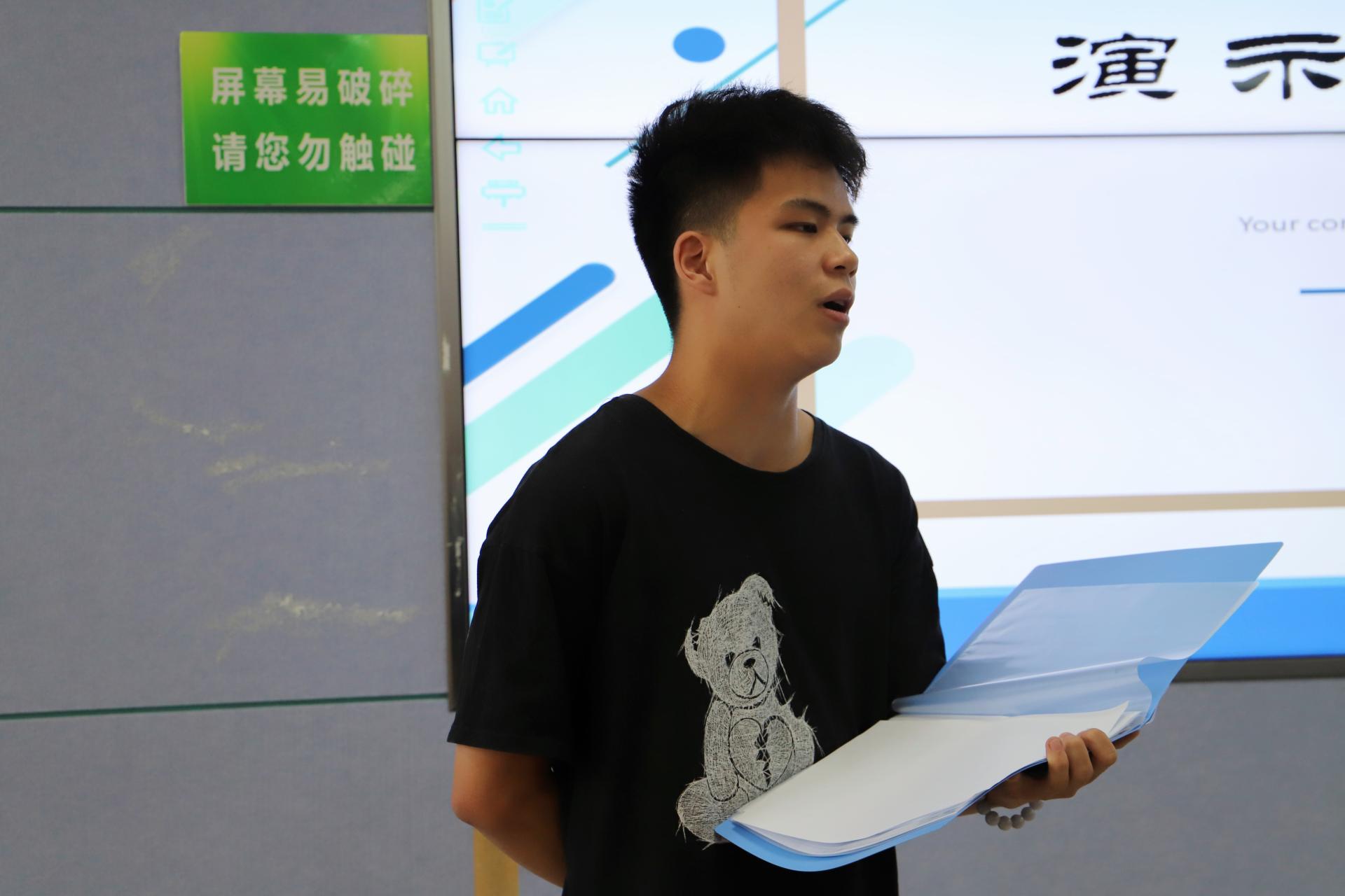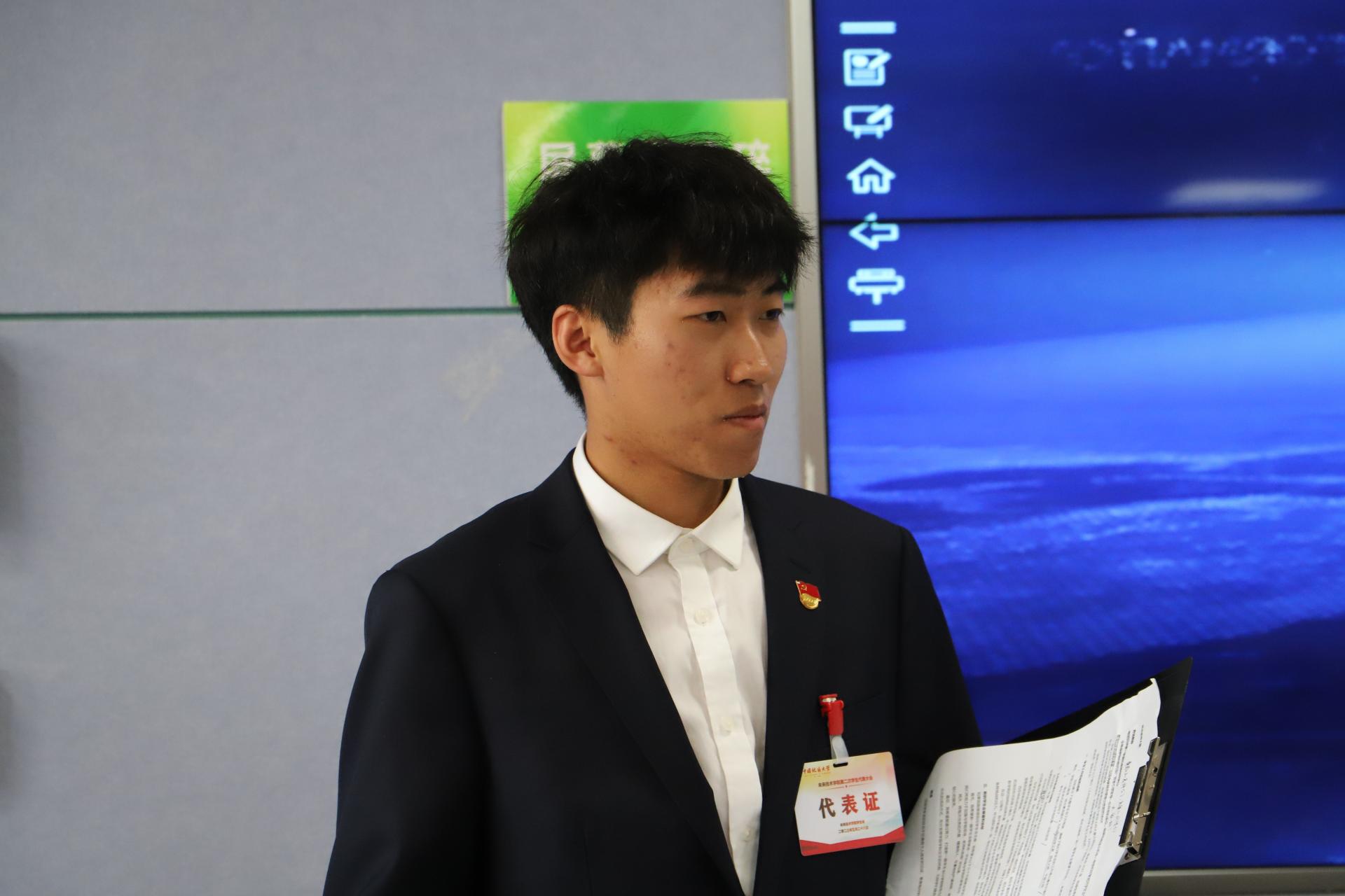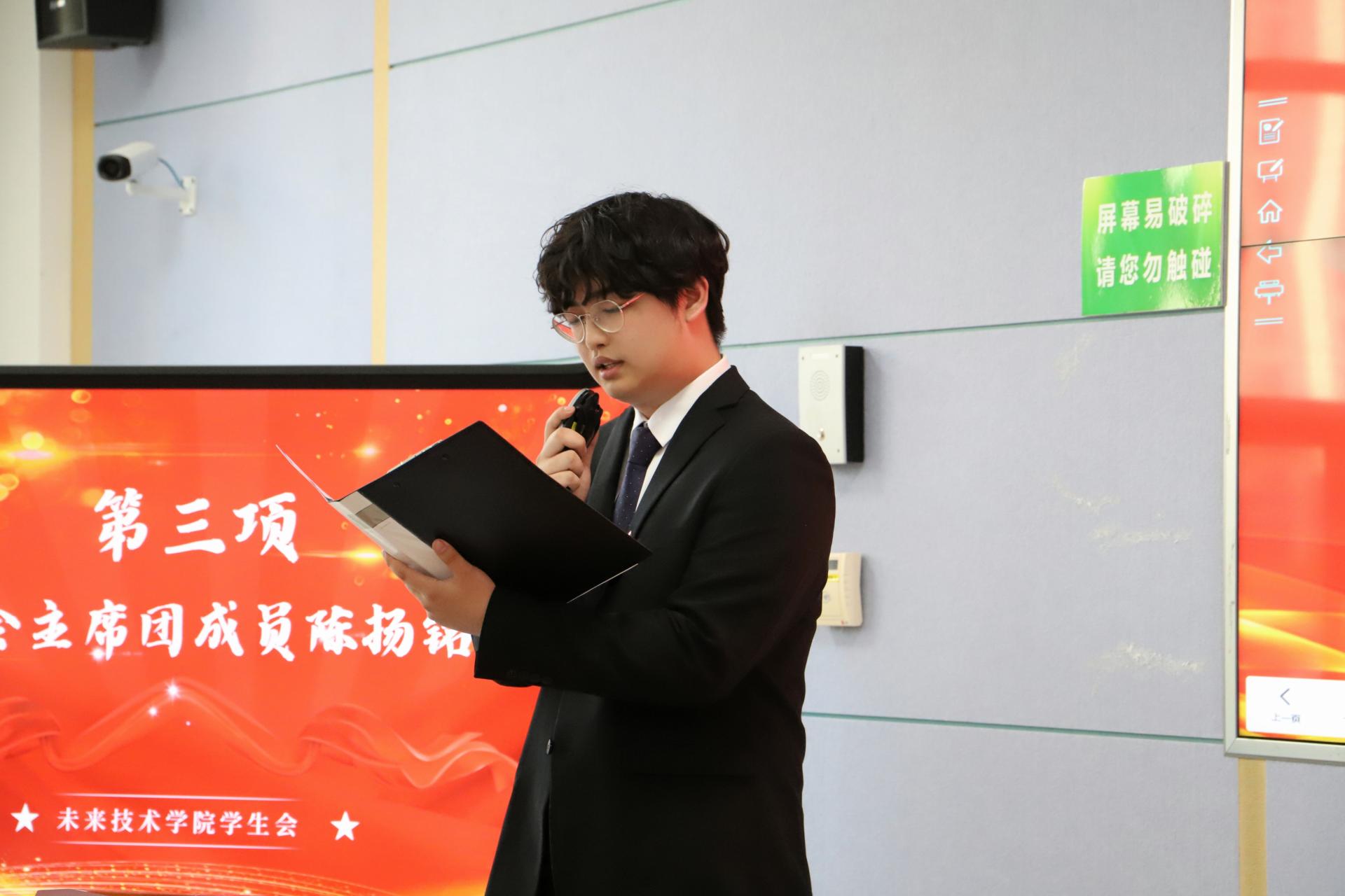 校學生會主席團成員陳揚銘發(fā)言。他宣讀了校學生會對未來技術學院召開第二次學生代表大會作出的批示,肯定了我院學生會成立以來在各方面取得的建設成效,并對未來工作方向提出建議。