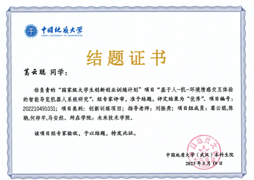 作為學(xué)院首屆60名本科生之一,葛云聰同學(xué)自進(jìn)入學(xué)院學(xué)習(xí)以來,就非常重視自身創(chuàng)新意識和創(chuàng)新思維的提升。大一時他便在班主任劉振燾老師的指導(dǎo)下,成功申請一項(xiàng)國家級大學(xué)生創(chuàng)新創(chuàng)業(yè)訓(xùn)練計(jì)劃,經(jīng)過一年的研究與實(shí)踐,項(xiàng)目順利結(jié)題并被評為“優(yōu)秀”。大二上學(xué)期,葛云聰成功入選學(xué)院首批“本-碩-博”貫通培養(yǎng)計(jì)劃遴選,同時在學(xué)院的大力支持下,與同學(xué)一起以《復(fù)雜水環(huán)境地質(zhì)勘測與環(huán)境監(jiān)測智能機(jī)器人系統(tǒng)》為題,參加“探索與猜想計(jì)劃”。入校不到兩年,葛云聰在導(dǎo)師團(tuán)隊(duì)的帶領(lǐng)下,在學(xué)院平臺的支撐下,已積累多項(xiàng)科研訓(xùn)練與創(chuàng)新競賽經(jīng)驗(yàn),為后續(xù)科研與學(xué)習(xí)打下堅(jiān)實(shí)基礎(chǔ)。