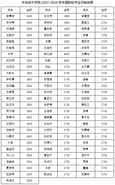 根據(jù)本科生院《關(guān)于開展2024年國家獎助學(xué)金評選工作的通知》《關(guān)于2024國家助學(xué)金資助等級標準通知》要求,給予特殊困難認定學(xué)生給予每人4800元資助(同年度獲得國獎或國勵為4200元),困難認定學(xué)生給予每人3600元資助(同年度獲得國獎或國勵為3000元),一般困難認定學(xué)生給予每人2700元資助(同年度獲得國獎或國勵為2500元)。